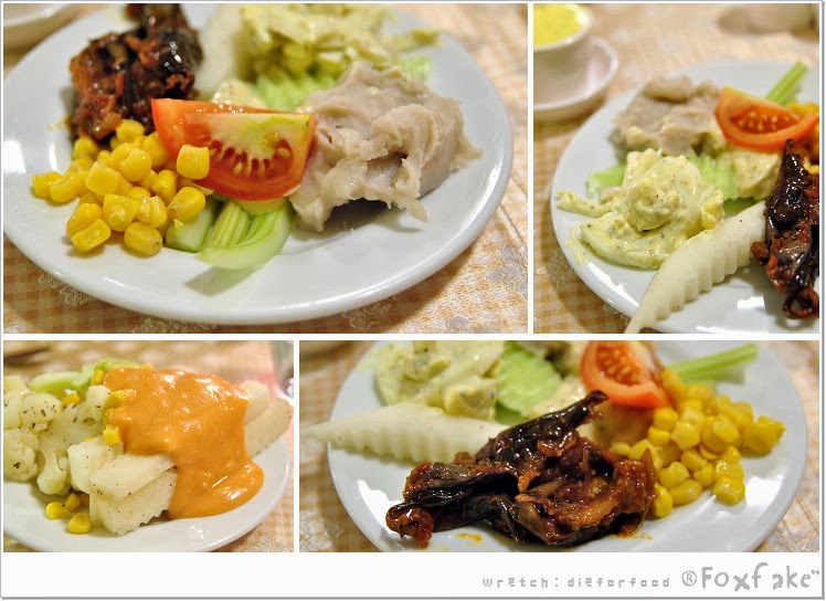 ‧沙拉吧其他食材如:玉米、蕃茄、芹菜棒、新鮮生菜、義式茄子、山藥棒,還有醃漬花椰菜。
