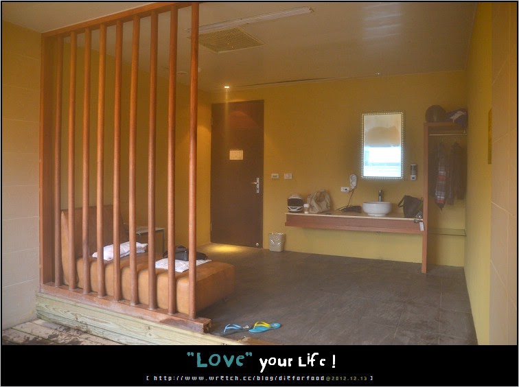 濕區即淋浴區與觀音石大湯池,泡一家子都綽綽有餘;湯池旁的玻璃窗貼上霧面防外頭偷窺,覺得有點可惜,畢竟這高度應該是沒人看得見的呀XDDDD